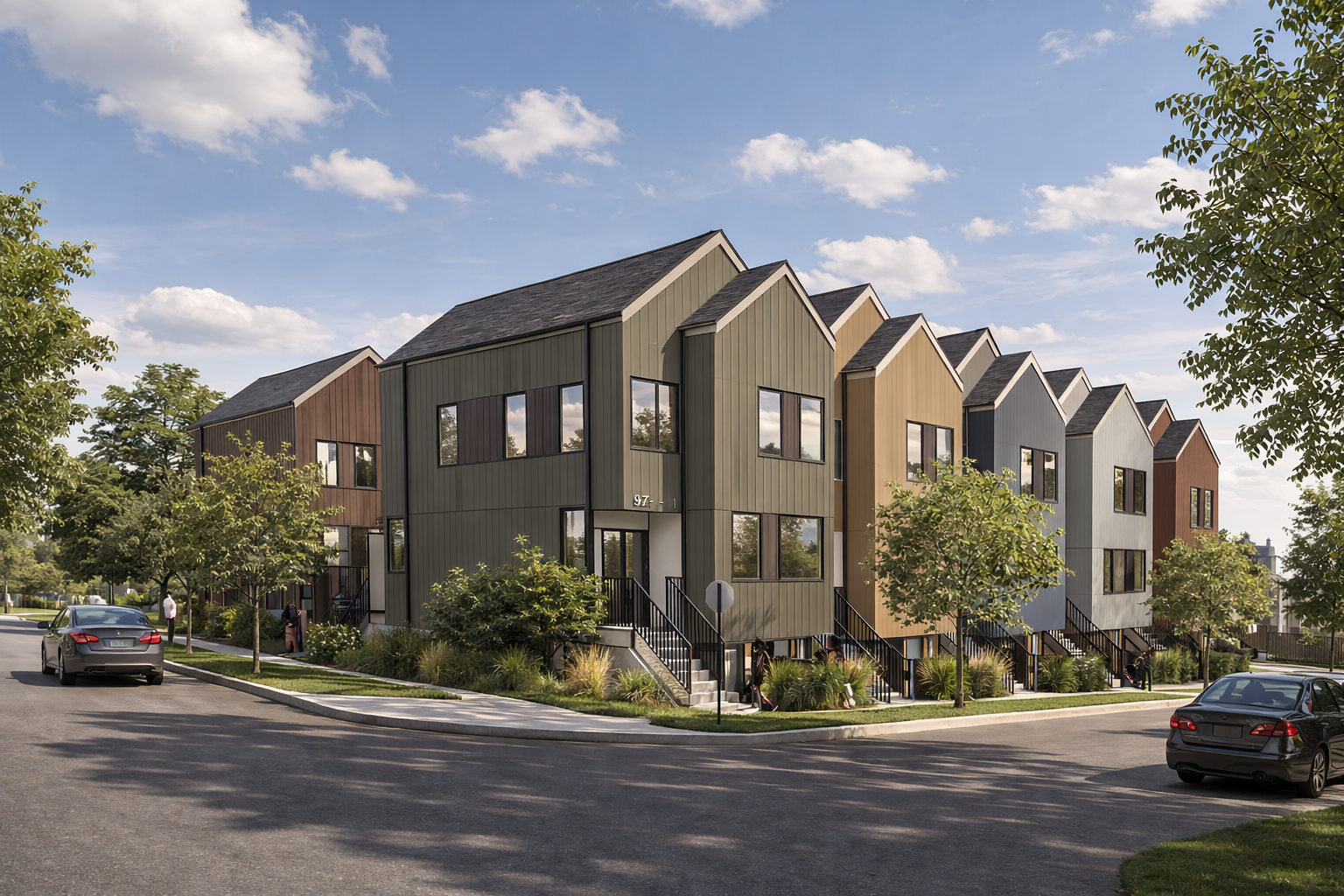 This multi-family townhome project was concieved out of the need for family-focused housing, in the growing district of Saanich. 20 units of stacked townhomes flank a sloped site, creating a courtyard area between both buildings that services as a community outdoor space.