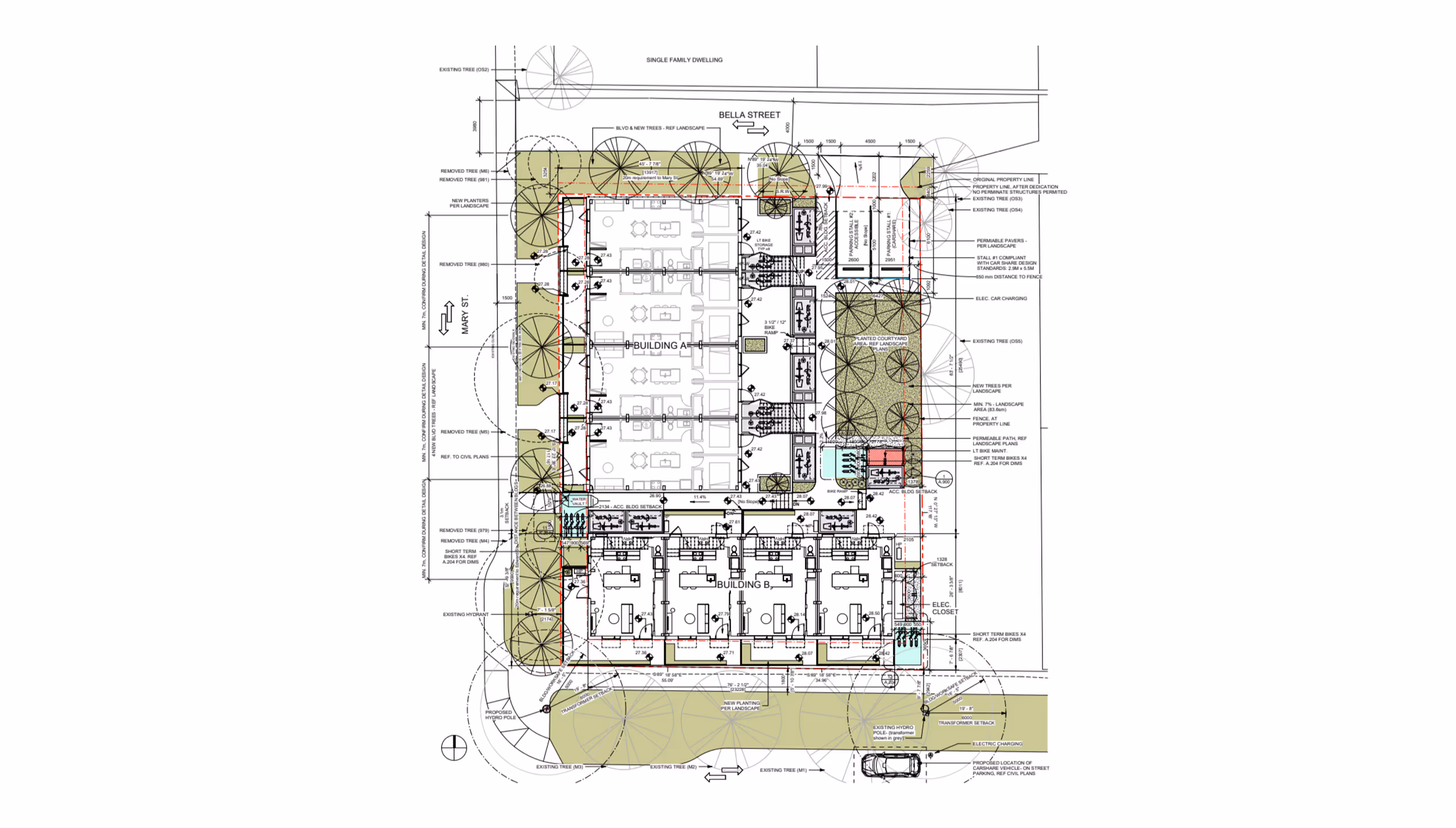 A common courtyard space with bike maintenance facility and car-sharing promotes community building between residents. Permeable landscaping, native plants and fruit trees provide privacy and shady areas for residents to congregate.
